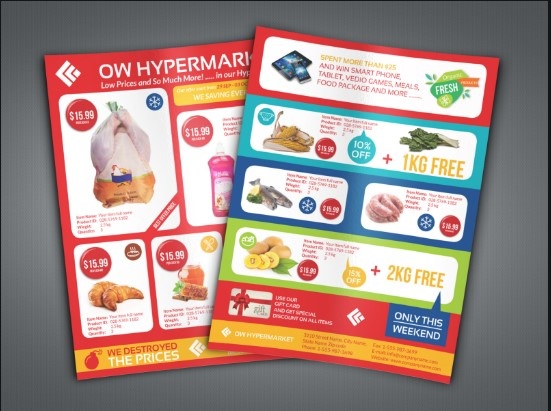 - Tờ rơi quảng cáo siêu thị, tờ rơi cửa hàng bách hóa có số lượng phát hành lớn nên loại giấy thường được sử dụng là giấy mỏng để giảm giá thành. Tờ rơi quảng cáo cho siêu thị, tiệm tạp hóa nên được in ấn và phát thường xuyên, giá cả nên được in nổi bật trên tờ rơi để thu hút người tiêu dùng.